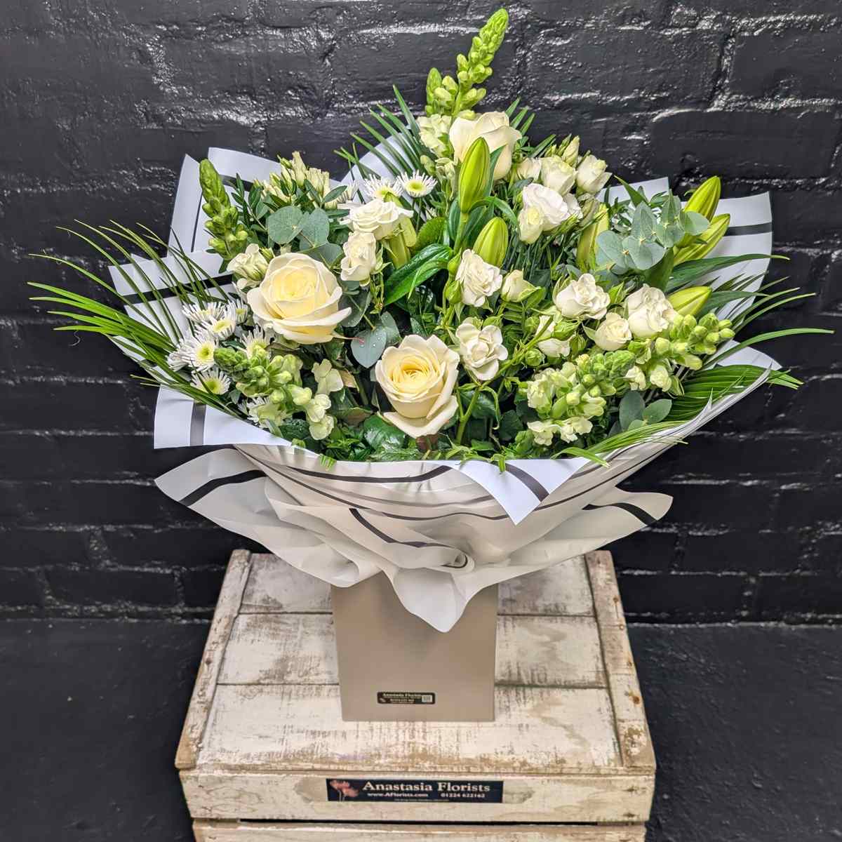 Please note that Anastasia Florists may occasionally substitute flowers or foliage for items of a similar style, quality and value. It may not always be possible to include every variety exactly as shown. If this happens, we will make every effort to replace them with suitable alternatives while keeping the overall “Lilly Exquisite” look and value of the bouquet.