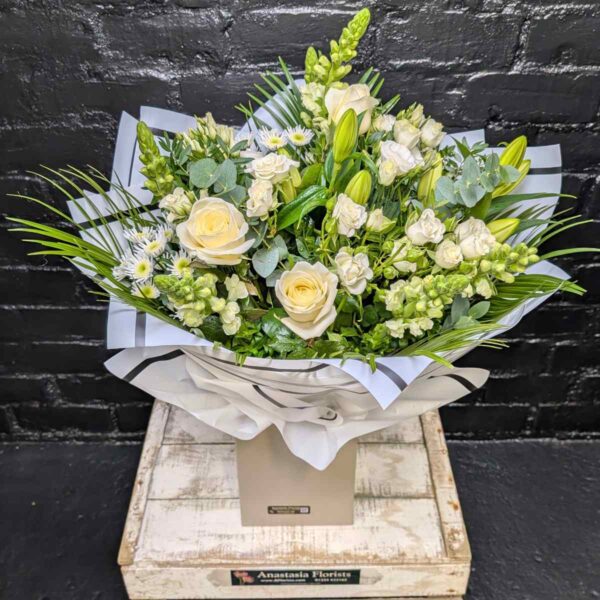 This hand-tied bouquet features large white lilies, ivory roses, gerbera-style blooms and other seasonal white flowers, arranged with rich greenery and eucalyptus to give structure and movement. The stems are tied off with a soft organza-style ribbon, creating a luxurious bouquet that can be placed straight into a favourite vase at home or used as a formal presentation bouquet.