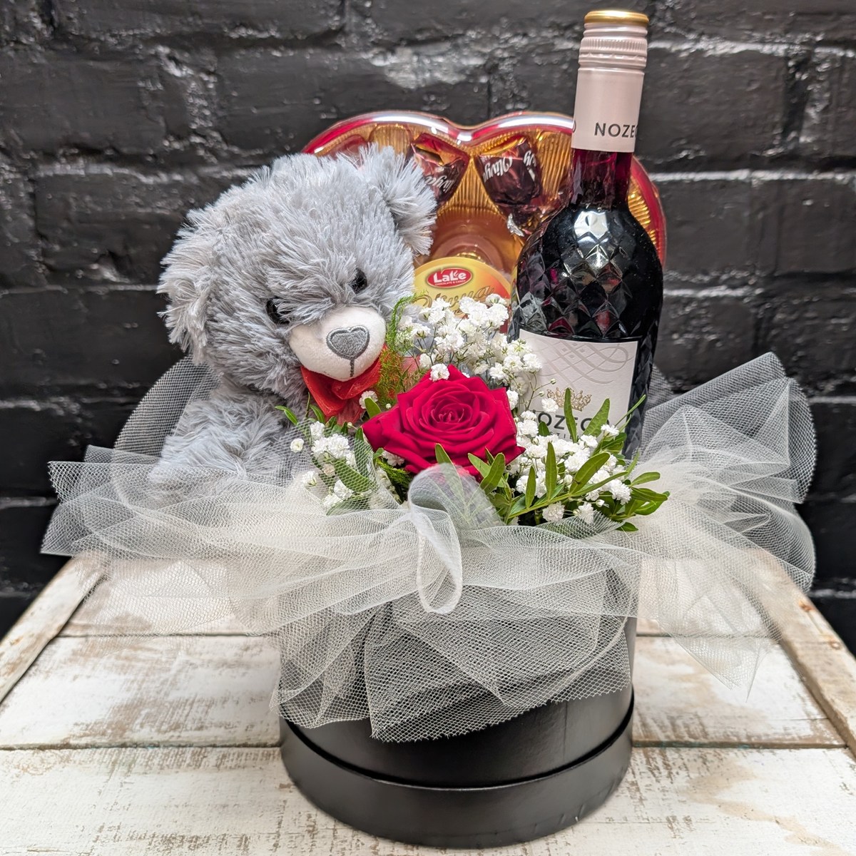 This luxurious hat box arrangement includes a soft grey teddy bear, a heart-shaped box of chocolates, and a stylish bottle of non-alcoholic rosé. Nestled beside them is a single rich red rose with Gypsophila (Baby’s Breath) and fresh foliage, all surrounded by clouds of soft white tulle for a dreamy, romantic finish.