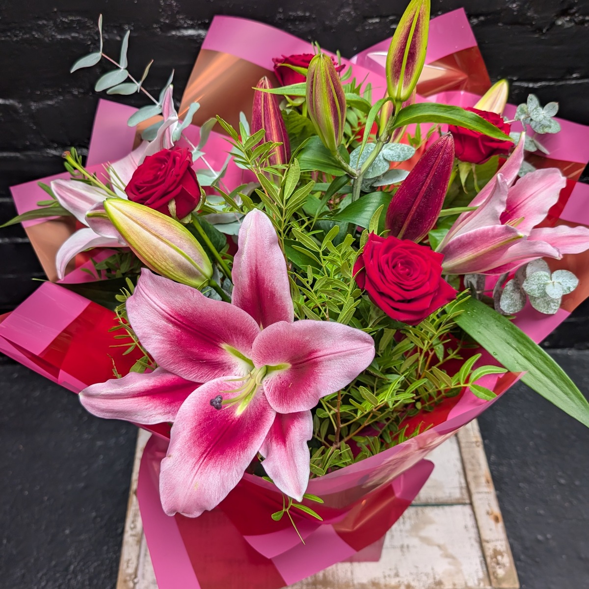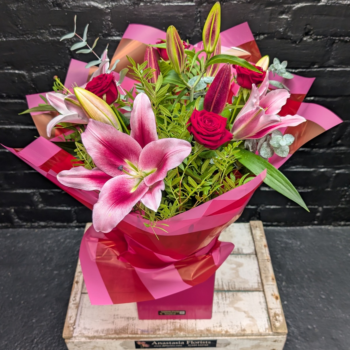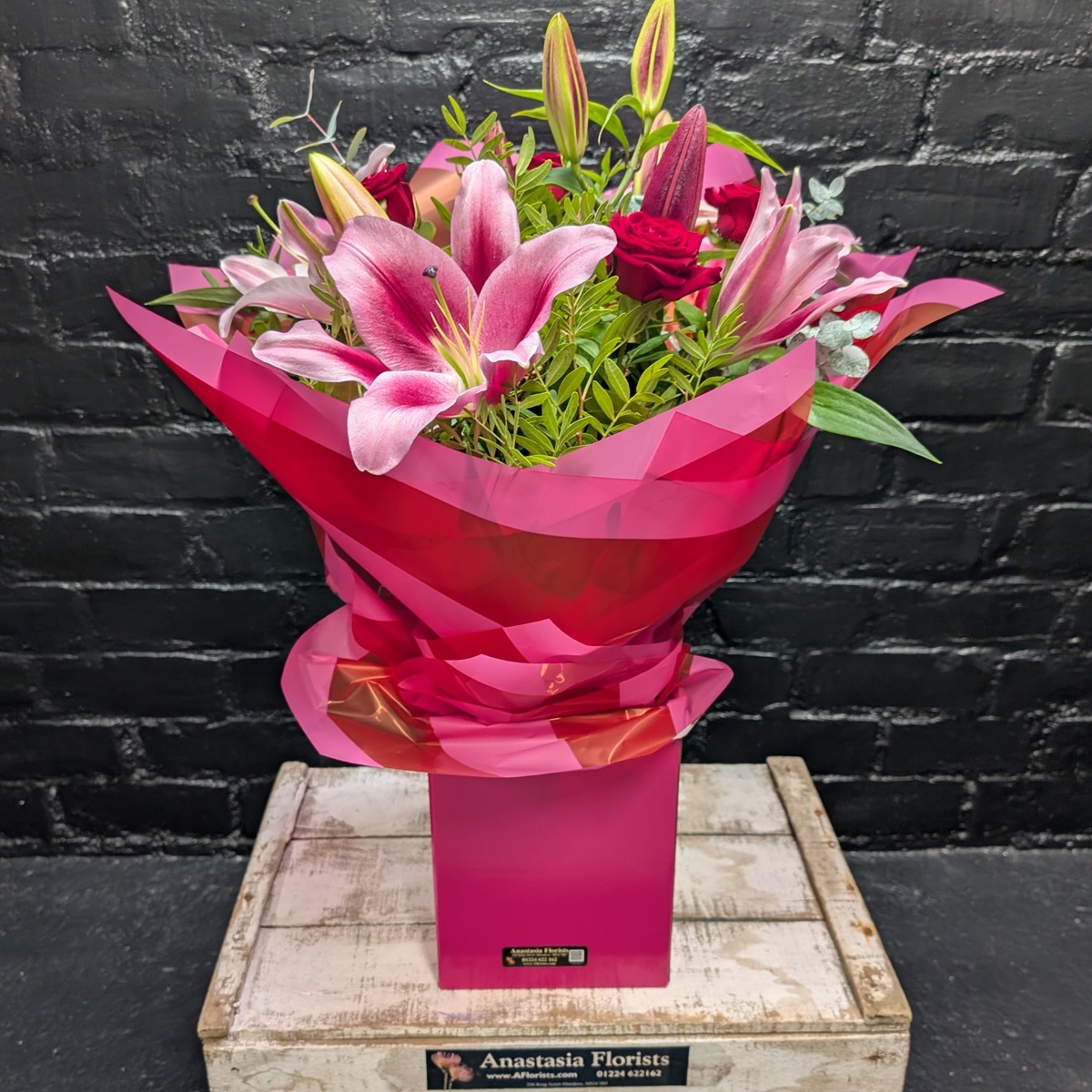 Ignite the room with the vibrant beauty of the Lucy Flower Bouquet. This stunning Aberdeen flower arrangement features bold, eye-catching pink Stargazer lilies (or equivalent large pink lilies) and unopened buds, beautifully contrasted with deep ruby red roses.