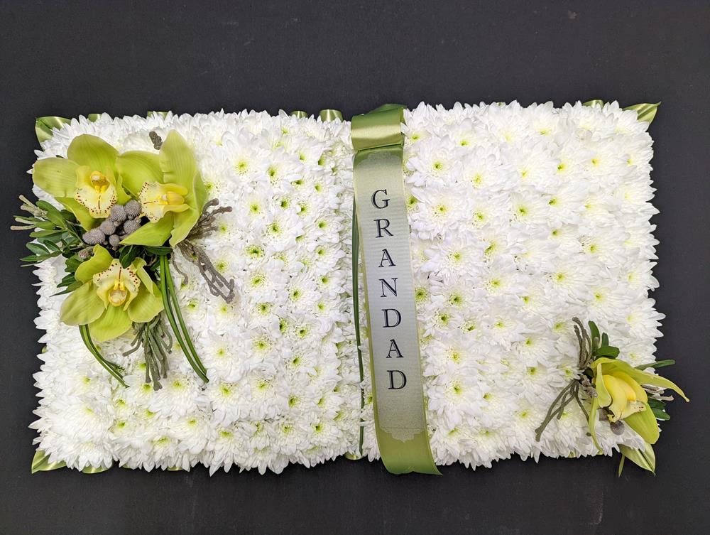 An elegant Open Book Funeral Tribute with a massed white chrysanthemum base, finished with green cymbidium orchids and a “Grandad” ribbon. All Funeral Items have free delivery either delivered to the funeral directors or the customers home address.