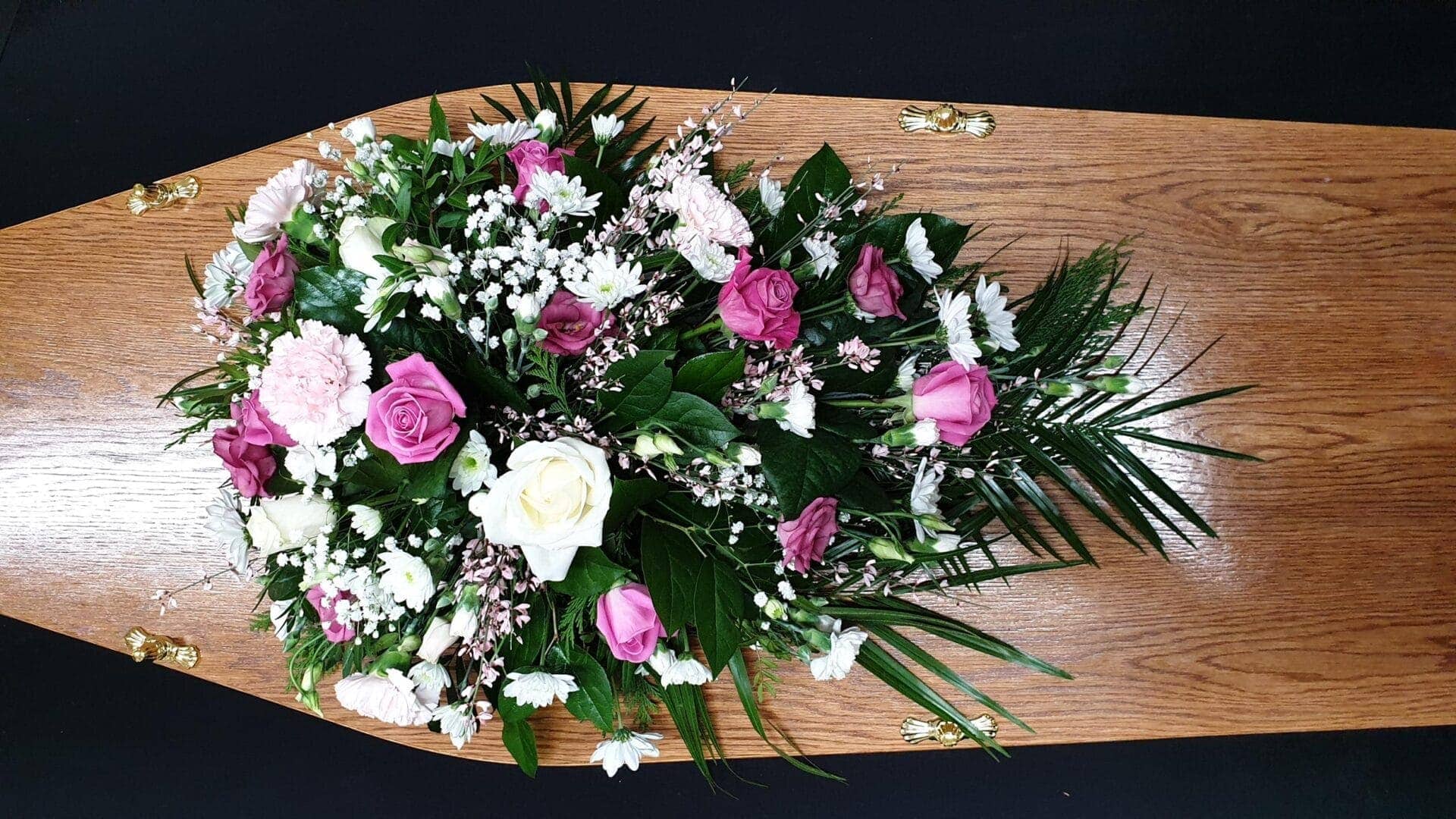 The Pink & White Rose Single Ended Spray is a gentle and elegant tribute, designed in a classic single-ended (teardrop) shape – rounded at one end and tapering to a point at the other. This style is ideal for resting on top of the coffin or beside the casket.
