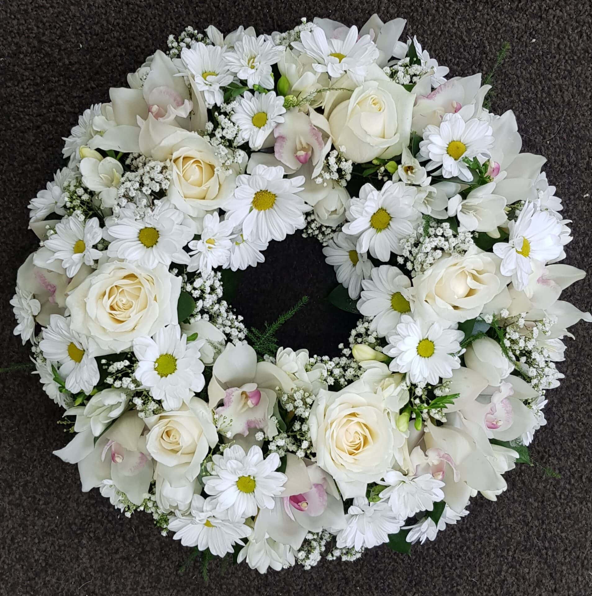 A peaceful all-white funeral wreath with roses, daisy-style flowers, orchids and gypsophila, arranged in a classic open circle. A gentle, elegant tribute with free delivery to Aberdeen funeral directors or the family home.